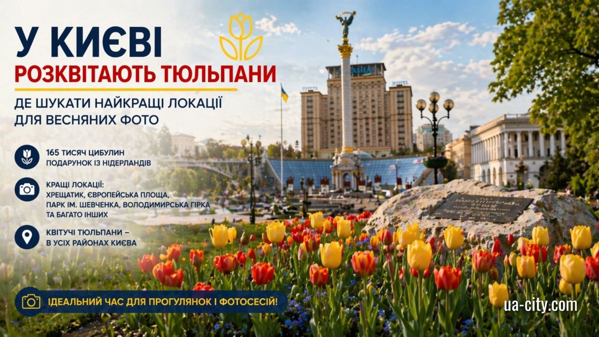 У столиці України офіційно розпочався один із найяскравіших періодів весни — сезон цвітіння тюльпанів. Уже зараз кияни та гості міста можуть побачити перші розквітлі квіти, а найближчими днями очікується справжній пік — коли сотні тисяч тюльпанів перетворять вулиці та парки на кольорові фотозони.